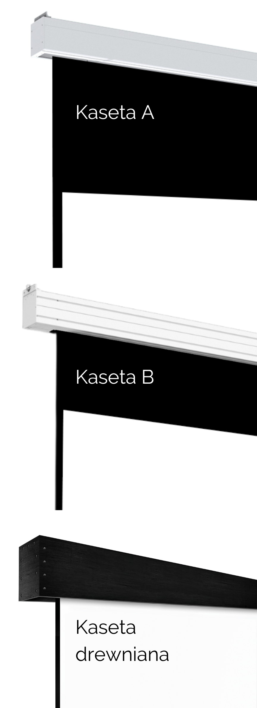 - 3 różne rozmiary/przekroje kasety ekranu oraz bębna nawojowego dla różnych szerokości ekranów: