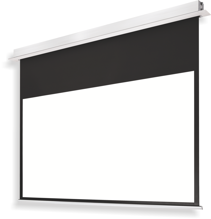 Elektrycznie rozwijany ekran projekcyjny z linii PROFESJONALNEJ PREMIUM dedykowany do zabudowy sufitowej.