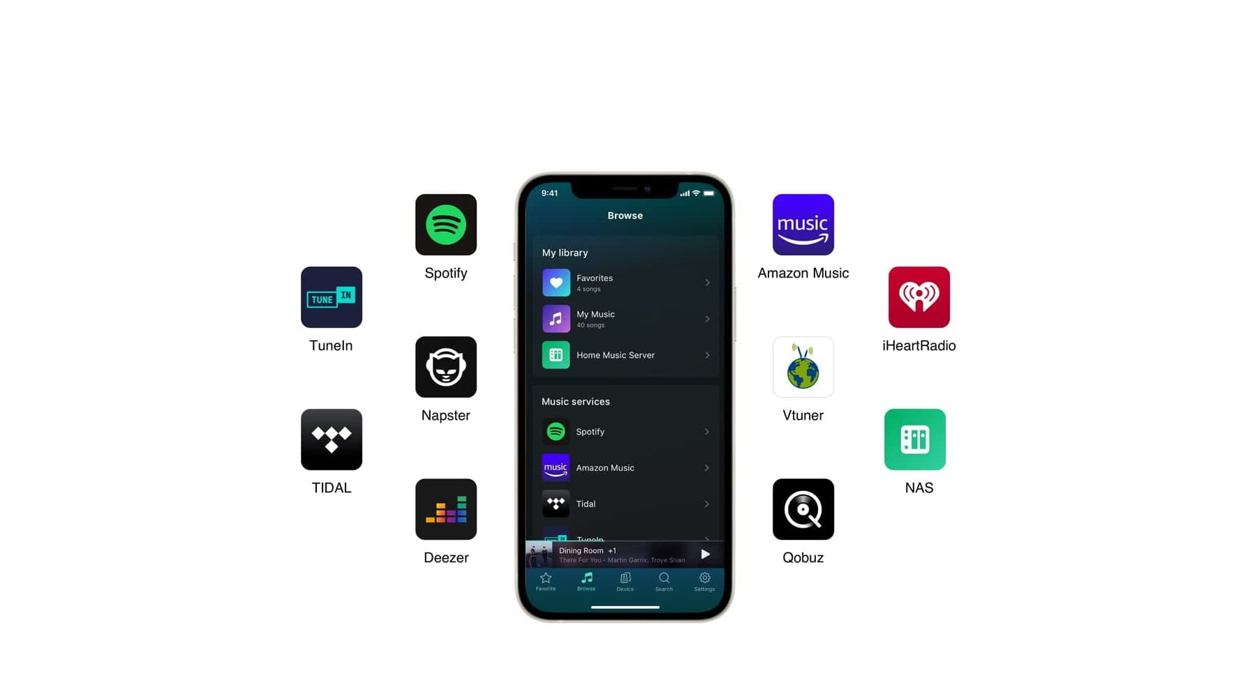 - Streaming - Spotify, Amazon Music, Deezer, Tunein, Tidal, Qobuz, iHeartRadio, Napster, Soundmachine, Calm Radio itd.