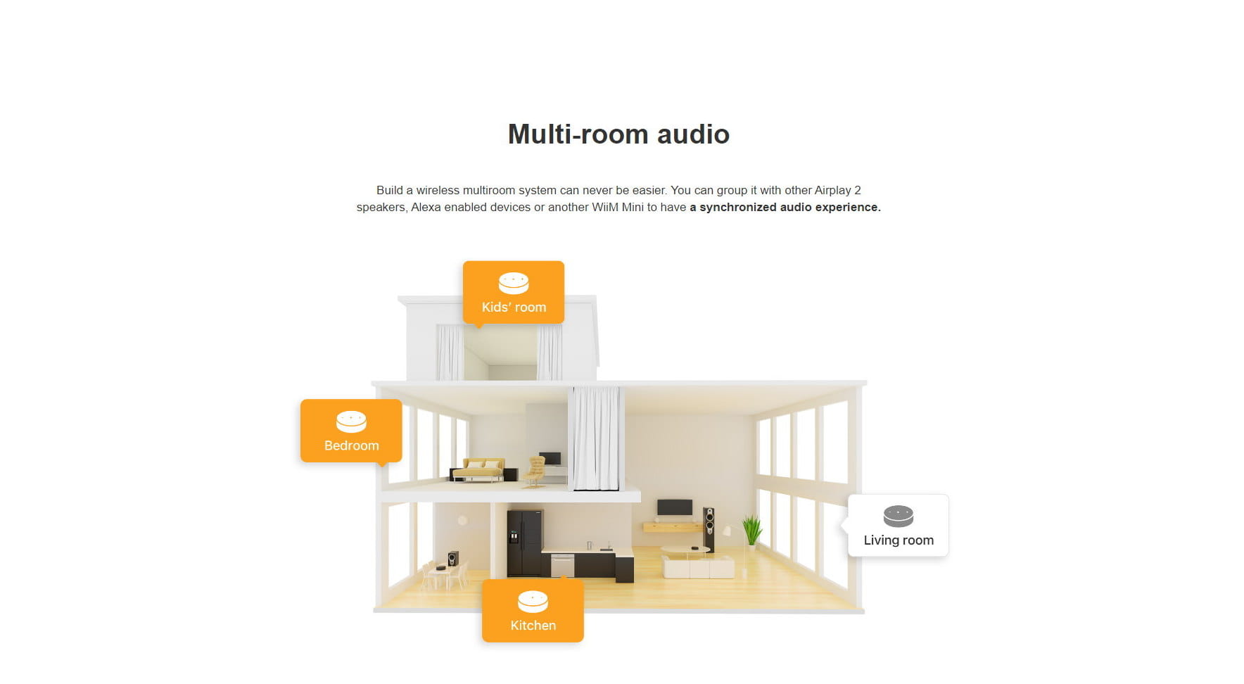 Z łatwością zbuduj swój system dźwiękowy multiroom za pomocą głośników AirPlay 2 lub Amazon Echo, korzystając ze strumieniowego przesyłania poprzez Wi-Fi jako źródła. Korzystając z istniejących urządzeń audio, możesz stworzyć bardziej elastyczny system dźwiękowy multiroom z wieloma WiiM Mini. WiiM Mini obsługuje multiroom z różnych źródeł dźwięku, w tym z wejścia WiFi, bluetooth lub Aux. Dzięki temu jest wszechstronny w prawie każdej opcji słuchania muzyki.