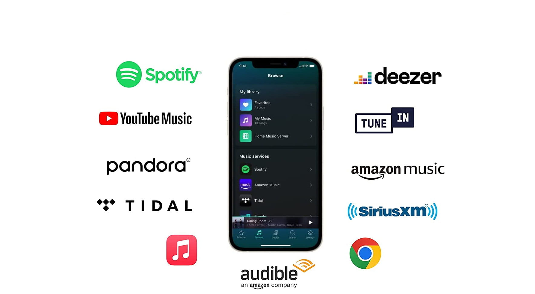 - Streaming - Spotify, Amazon Music, Deezer, Tunein, Tidal, Qobuz,SoundCloud, Pandora, iHeartRadio, Napster, Soundmachine, Calm Radio i inne.