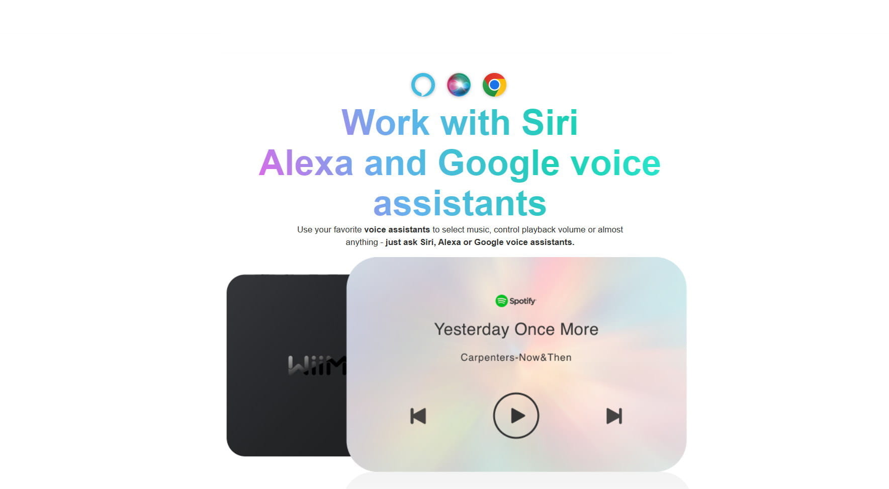 Poproś Alexę, Siri lub Google Voice o sterowanie WiiM Pro w celu odtwarzania muzyki, słuchania wiadomości lub ulubionego podcastu za pomocą asystentów głosowych w Twoim smartfonie, HomePod, Echo lub urządzeniach Google Home. Zautomatyzuj WiiM Pro z innymi inteligentnymi urządzeniami domowymi, tworząc procedury w aplikacji Alexa, Apple Home lub Google Home.